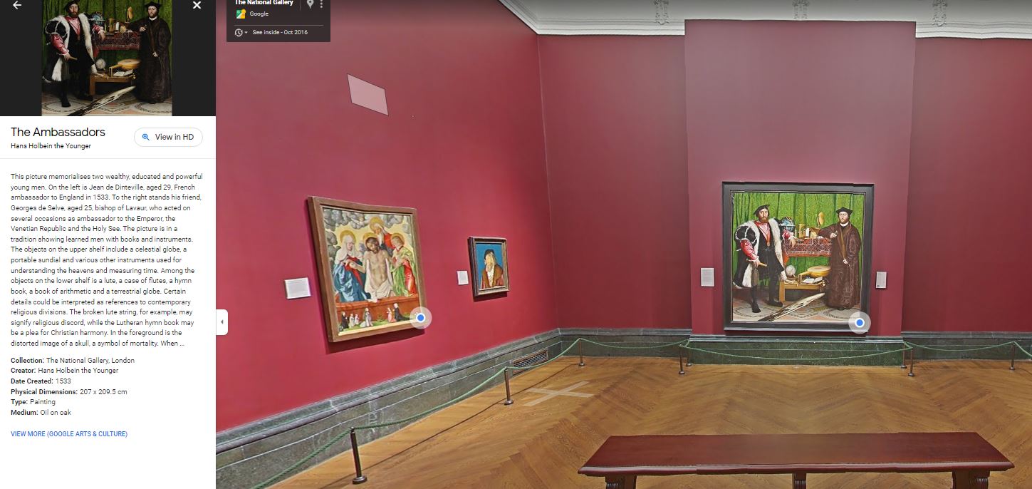 Some are easier to navigate around than others: I failed to access the upper floors of some museums, whereas in others it was easy to go up or down the staircases. The Dulwich Picture Gallery was particularly simple to navigate and you could get a good view of the paintings. Many art galleries, when viewed digitally, have a circle in front of the paintings which you can click and a side panel opens on your screen giving you more detail about the picture in question.