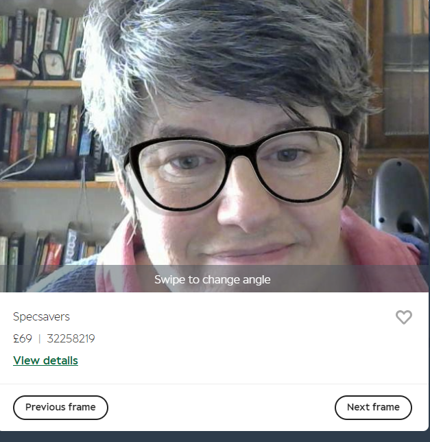 On the site they have a cunning device where if you have a camera on your computer, it can take a photograph of your face then you can virtually try on different glasses. I only found one pair that I liked so we rang up and ordered those.